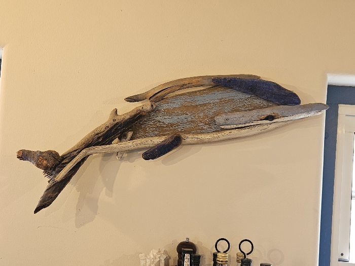 A driftwood art piece resembling a whale is mounted on a beige wall