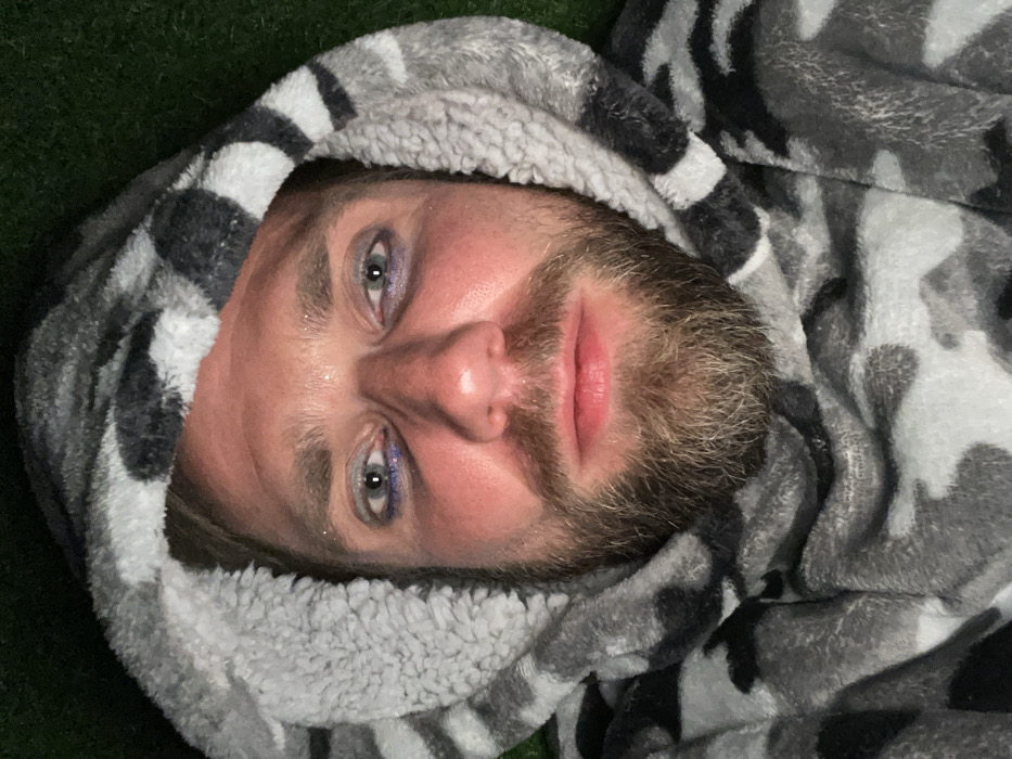 A person with a beard lies on a surface with green patches. The person is facing the camera, with eyes open and wearing blue glitter eye makeup. The person is covered in a gray and white camouflage-patterned hooded blanket, with the hood framing the face. The hooded blanket is also lined with a fluffy, sherpa-like material.