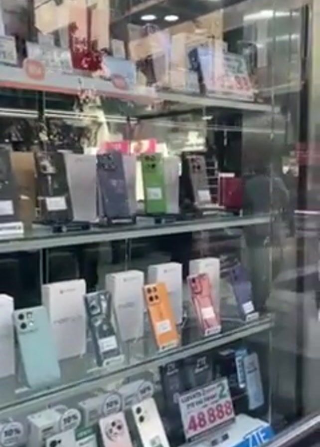 display case of mobile phones in a shop window. Several different brands and models of phones are visible, including Motorola, ZTE, Oppo, Samsung, and Nubia. Most of the phones are new and in their boxes, some are standing up on display with small stands, and some have price tags or discount signs next to them. The display case is well lit, and reflections from the street outside can be seen on the glass.