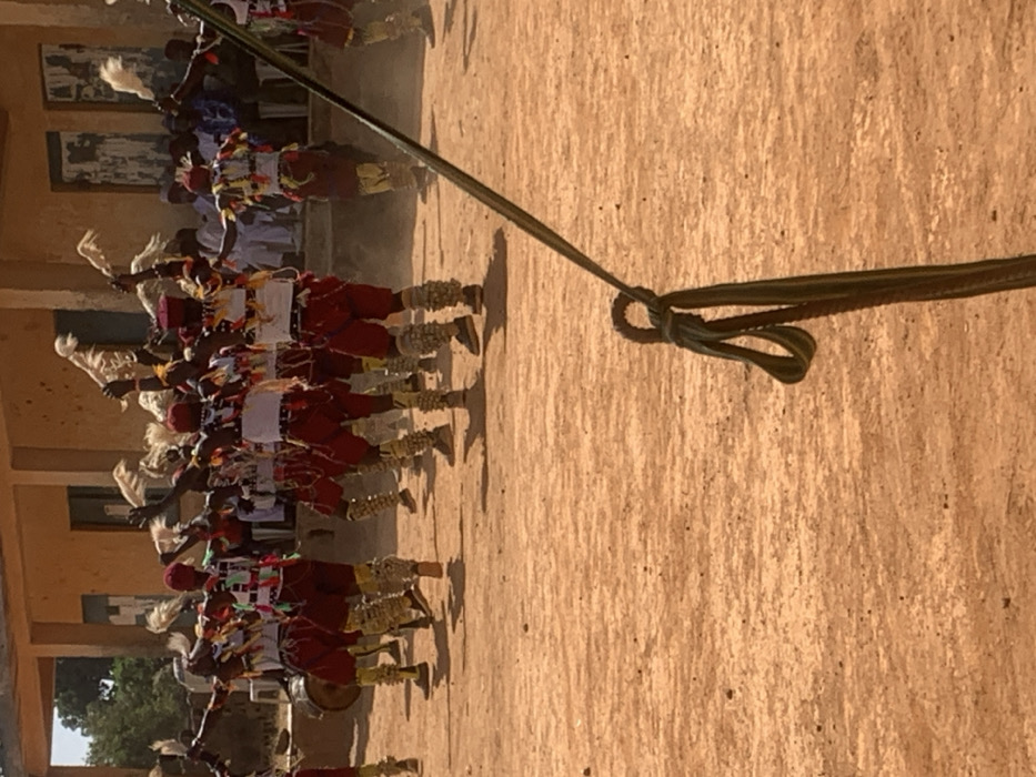 This image captures an outdoor cultural performance in Miango, Nigeria, on a dry, reddish-brown dirt ground