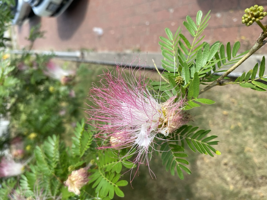 The image depicts a close-up, angled view of a flowering plant branch within an urban environment in Santa Cruz de la Sierra, Bolivia. The primary subject is a single, large "pompom" style flower, characterized by numerous fine, thread-like stamens. These stamens are white at their base, transitioning to a vibrant pink at their tips, creating a brush-like appearance. The flower's central base shows a yellowish tint, and some brownish, withered filaments are visible at the lower periphery of the bloom, suggesting a mature or slightly past-peak state. The branch features small, ovate, pinnately compound green leaves. Several clusters of small, green, spherical flower buds are also present on the branch, indicating ongoing growth. In the blurred background to the immediate left and behind the main flower, additional green foliage and other pink-hued flowers of the same species are discernible. To the right of the main flower, a reddish-brown brick or paver sidewalk is visible, separated by a low, grey concrete curb or divider. Beyond the curb, in the upper right quadrant of the image, the front portions of at least two white vehicles are partially visible, blurred and out of focus, suggesting a street or parking area adjacent to the sidewalk. The scene is illuminated by natural daylight. No human figures or overt actions are present.