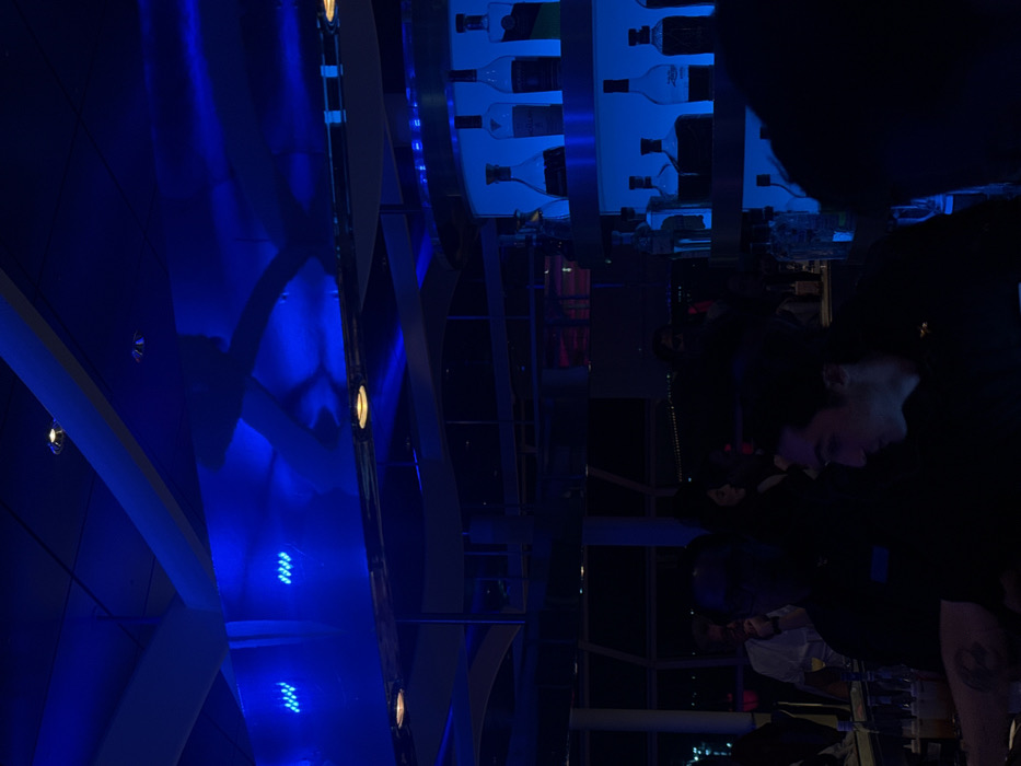 Inside a dimly lit bar or club, an angled view captures the vibrant blue lighting scheme