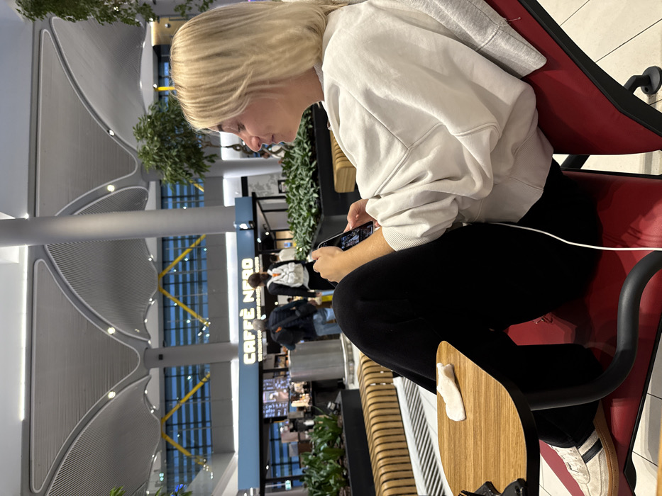 This image depicts an indoor scene within the Istanbul Airport (IST) terminal, located in Arnavutköy, Turkey. A light-skinned female with shoulder-length blonde hair is visible in profile on the right, seated in a red airport lounge chair with her legs crossed. She wears a light-colored crew-neck sweatshirt and black pants. She is holding a dark-colored smartphone in both hands, appearing to interact with its screen, with a white charging cable extending from the device. A small, curved wooden side table is positioned to her left, on which a crumpled white tissue or paper item rests. In the mid-ground, a "Caffè Nero" coffee shop with a dark blue facade and white lettering is visible. Several individuals are present near the coffee shop, including one person wearing a white backpack. The terminal environment features a high, vaulted ceiling with integrated lighting, large windows revealing exterior yellow structural elements, modern seating arrangements, and numerous green plants in black planters. The floor is light-colored and reflective.