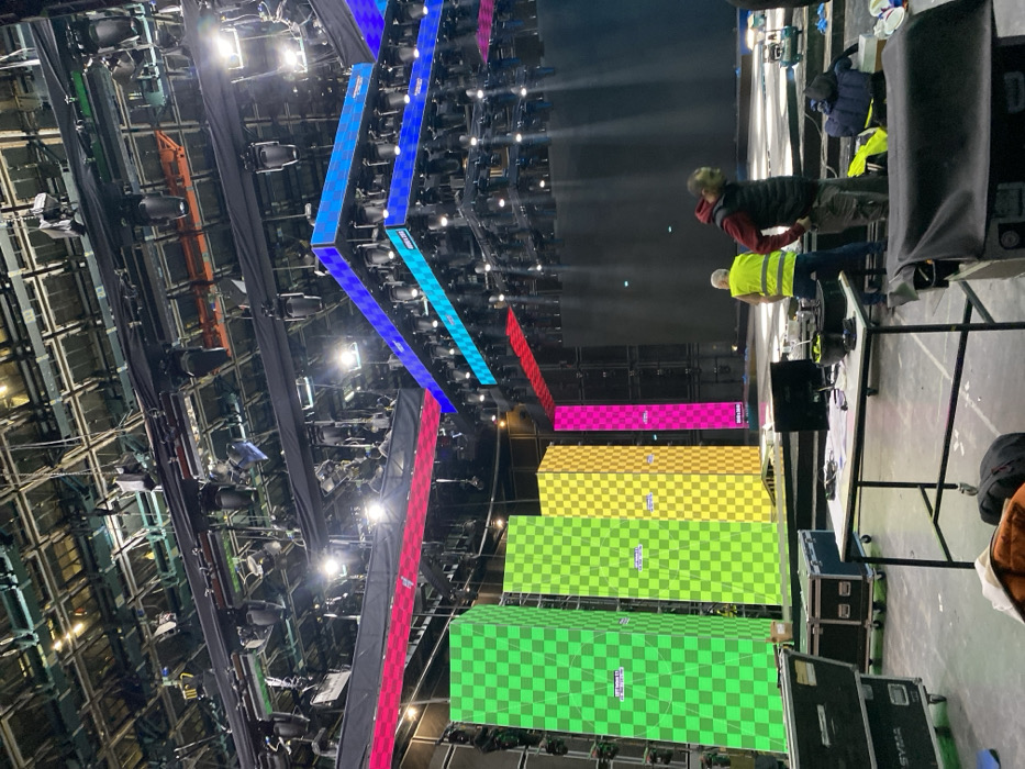 An indoor scene depicts a large-scale event or television studio environment, identified as being in the City of Cukarica Urban Municipality, Serbia. The facility features a high ceiling with extensive overhead black metal trussing, from which numerous professional stage lights, moving head fixtures, and LED screen elements are suspended. Prominent in the background is a large stage area with a dark backdrop. On the left side of the stage are four tall, vertical LED screen pillars displaying a bright, green and yellow checkered test pattern, with some showing text overlays like "SHT_Samo_TX" and resolution "1080x1920" or "800x1200." Overhead, horizontal strips of LED screens are suspended, displaying checkered patterns or solid colors in red, blue, and cyan. A multi-tiered structure of LED screens and lighting rigs is visible further back, also displaying blue and cyan checkered patterns. In the mid-ground, two adult males are present near a temporary workstation. The man on the left wears a yellow reflective safety vest over a dark long-sleeved shirt and dark pants, standing with his back partially to the camera, leaning over a table. The man on the right wears a dark red hooded sweatshirt with a dark grey vest and light-colored cargo pants, standing with his hands in his pockets, looking downwards. The temporary workstation, a black metal-framed table, holds a monitor (possibly ASUS branded), a keyboard, papers, and assorted cables and small equipment. To the far left, multiple black road cases, some labeled "SVMA," are stacked on wheels. Additional equipment, including a blue tarp and cables, is visible on the grey concrete floor around the workstation. The overall lighting is provided by the active stage lights and illuminated LED screens.