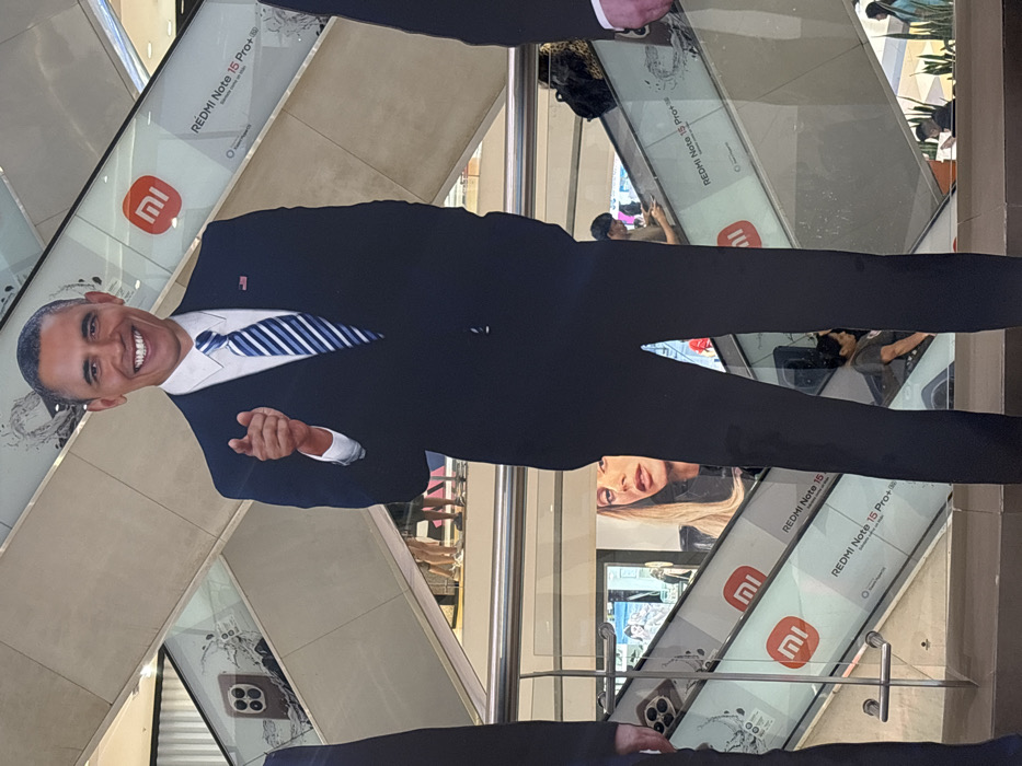 The image displays a life-size cardboard cutout of former U.S. President Barack Obama situated within a multi-level shopping mall in San Juan de Miraflores, Peru. Obama is depicted smiling, wearing a dark suit, white dress shirt, and a blue and white striped tie, with a small American flag pin visible on his left lapel. His right arm is extended, with the index finger pointing forward, while his left hand is partially visible, appearing to be in his pocket. In the background, a complex arrangement of escalators with glass balustrades and metal handrails ascends and descends. Advertisements are affixed to the side panels of the escalators, prominently featuring the red "Mi" logo of Xiaomi and text indicating "REDMI Note 15 Pro+". One visible advertisement depicts a smartphone with a distinctive multi-lens camera array, overlaid with a water splash graphic. Another partially obscured advertisement shows the face of a blonde woman, resembling Adele. Several individuals are present in the background: one person in a brown shirt is observed on an upper escalator, looking down at a mobile device. Another person in a gray shirt is visible on a lower escalator. Additional indistinct figures are seen further in the background, navigating the mall environment. Reflections on the glass surfaces of the escalators offer glimpses of other patrons and portions of the mall's interior architecture. Partial views of two other dark-suited figures flank the Obama cutout on the left and right edges of the frame. The area is illuminated by overhead artificial lighting typical of an indoor commercial space.