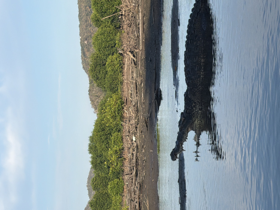 - "An enormous crocodile rests partially submerged in murky water near a shore lined with lush green foliage and a muddy bank" by FM-4tJwl2, licensed under CC BY 4.0