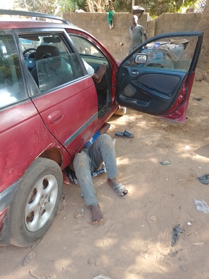 The image depicts an outdoor automotive repair scene in Yelwa, Nigeria
