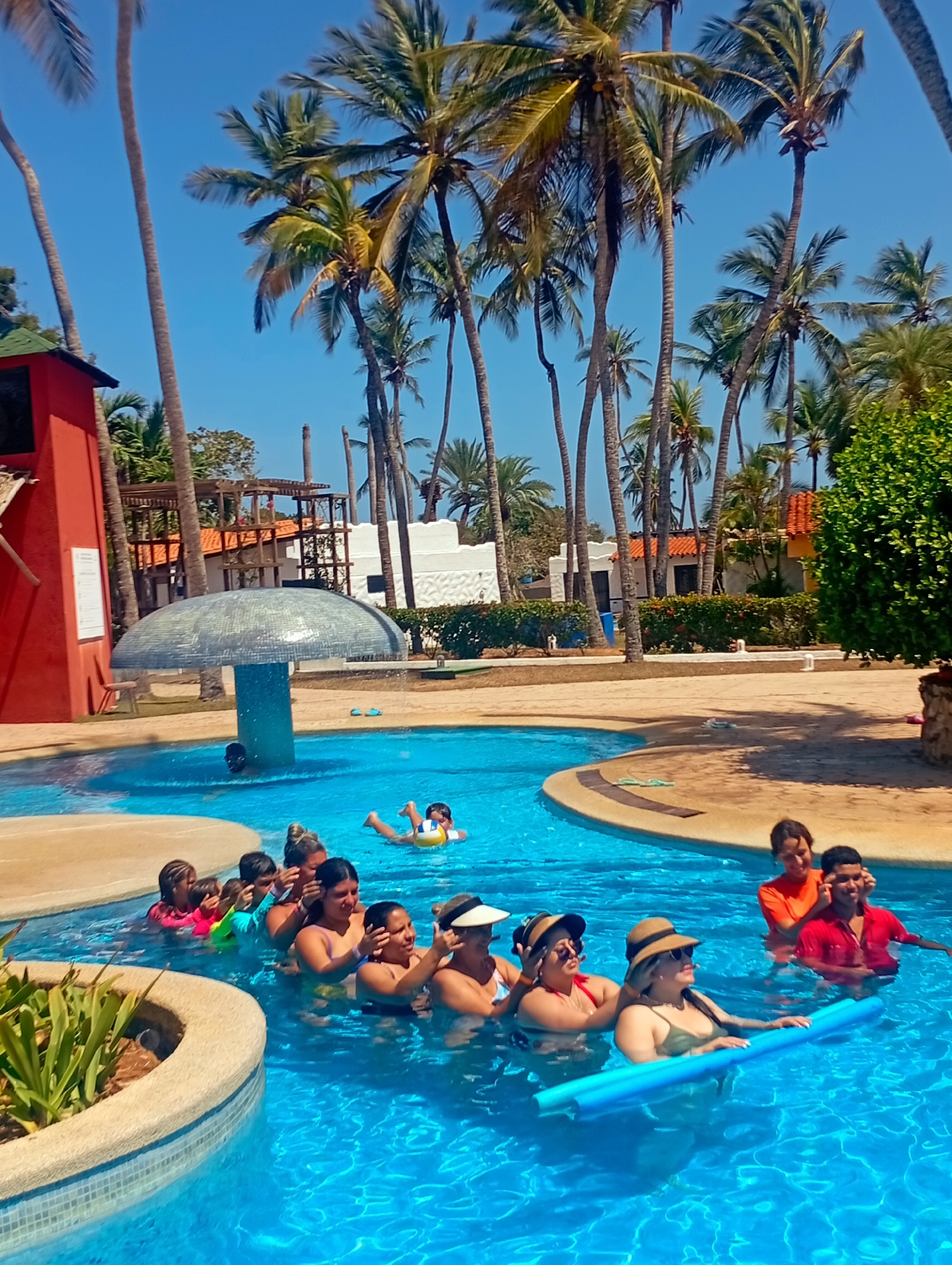 This outdoor shot depicts a brightly-lit swimming pool area on a sunny day, with palm trees visible in the background, indicative of a tropical location, likely in Playa El Agua, Venezuela. A group of about a dozen people is gathered in the pool, with some of them submerged up to their chests or necks. Several people are wearing hats and sunglasses. There is a mushroom-shaped structure in the pool, with water flowing from the top. A child can be seen with a flotation device in the water. Buildings and other vegetation are visible in the background beyond the pool area. The overall impression is that of a relaxing vacation scene.