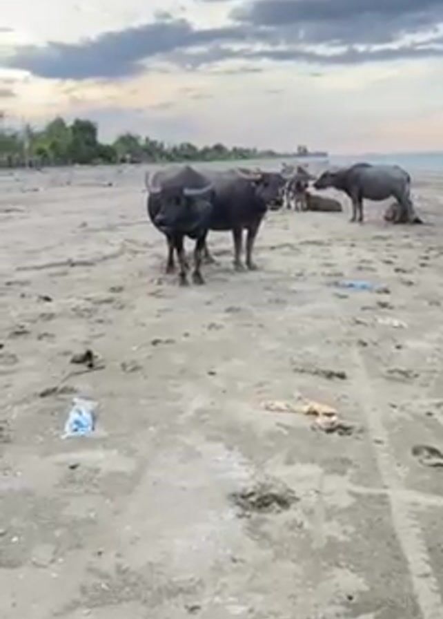 herd of water buffalo on a sandy beach. The sky is overcast with a hint of pink on the horizon. The sand is littered with debris. Several of the water buffalo are standing while others are resting on the sand. The camera pans slightly to the right, showing more of the beach and the ocean. The water is calm.