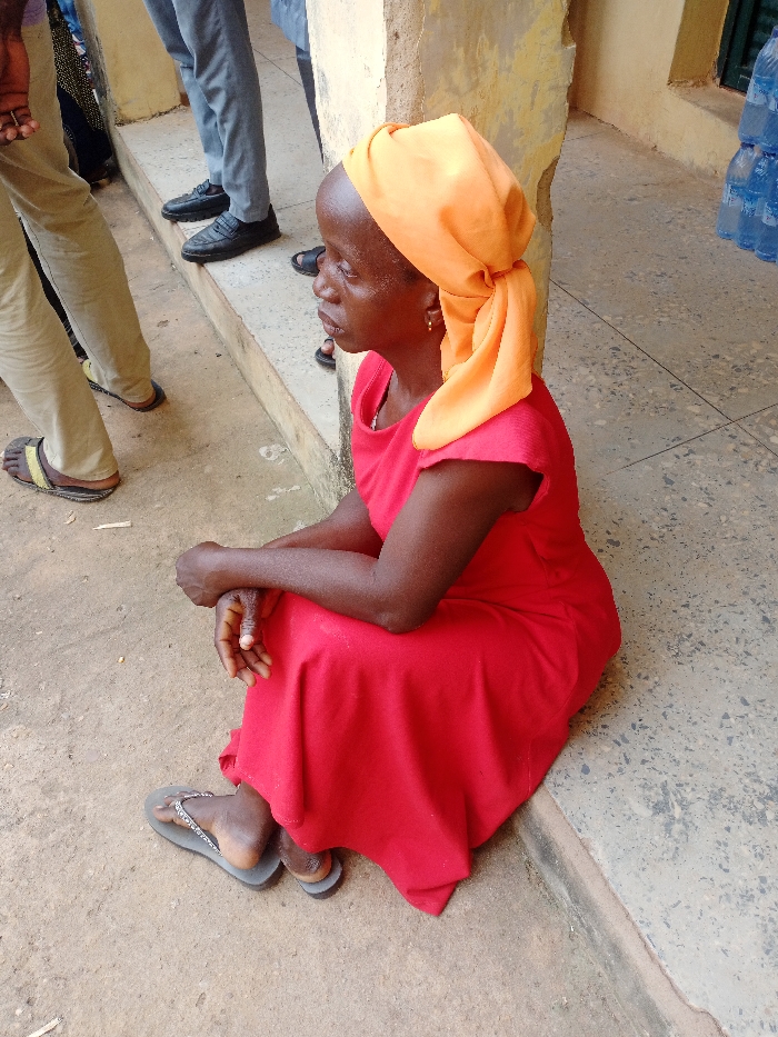 An adult female is seated on a rough, light brown concrete or dirt surface, leaning against a weathered yellowish concrete pillar or wall section. She is depicted in profile, facing left, with dark skin and an orange headscarf covering her head. She wears a plain, short-sleeved red dress and grey flip-flops. Her hands are clasped and rest on her lap. In the mid-ground, a raised concrete step or platform is visible, upon which the lower legs and feet of at least three other individuals are standing. One individual wears light brown trousers and yellow/black open-toed sandals, while another wears grey trousers and dark closed-toe shoes. To the far right of the frame, a stack of clear plastic water bottles is visible near a wall. The scene appears to be an outdoor or semi-sheltered public area. The specific city and state are not discernible.