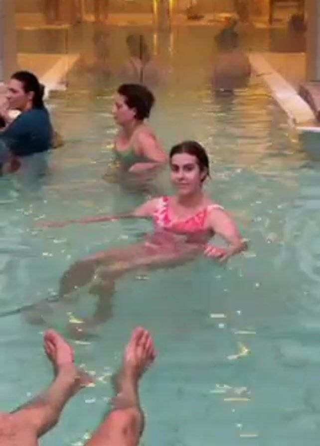 n indoor pool area with several people in the water. In the foreground, a pair of legs with green and blue patterned swim trunks are seen extended into the water. Three women are visible in the pool, with the woman nearest to the camera wearing a pink floral swimsuit. She is floating on her back and looking towards the camera with a smile. Behind her, two other women are also in the water. The pool is surrounded by a tiled deck, and a glass partition with more people on the other side is in the background. The overall lighting is bright and the water appears clean.