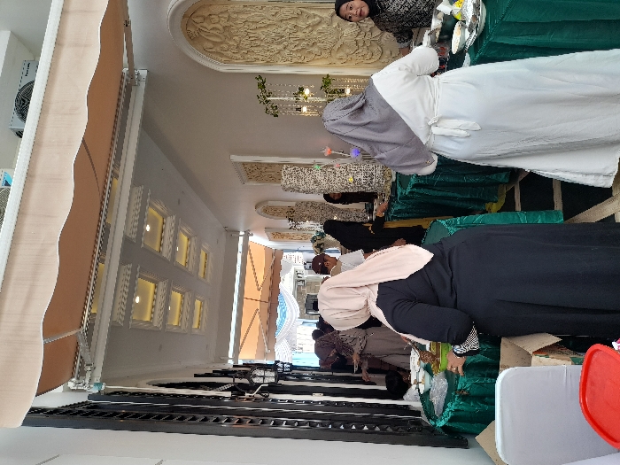 The image depicts a catered event taking place in an indoor space with a white ceiling and white walls decorated with ornate carvings. The location is in Kecamatan Buduran, Indonesia, at coordinates -7.433 latitude and 112.698 longitude. A retractable awning extends over the space. Several women, some wearing traditional head coverings, are standing in a line at a buffet table, while others are seated at the table, serving themselves food. There is a white chair in the foreground, and a red container is visible in the bottom left corner of the image. The tables are covered with green cloths. Decorations, including a tall tower of desserts, can be seen in the background. A woman in a white abaya, the traditional dress for women in many Muslim-majority countries, is standing at the buffet table, serving herself food. The scene portrays an elegant and organized gathering of people at a catered event.