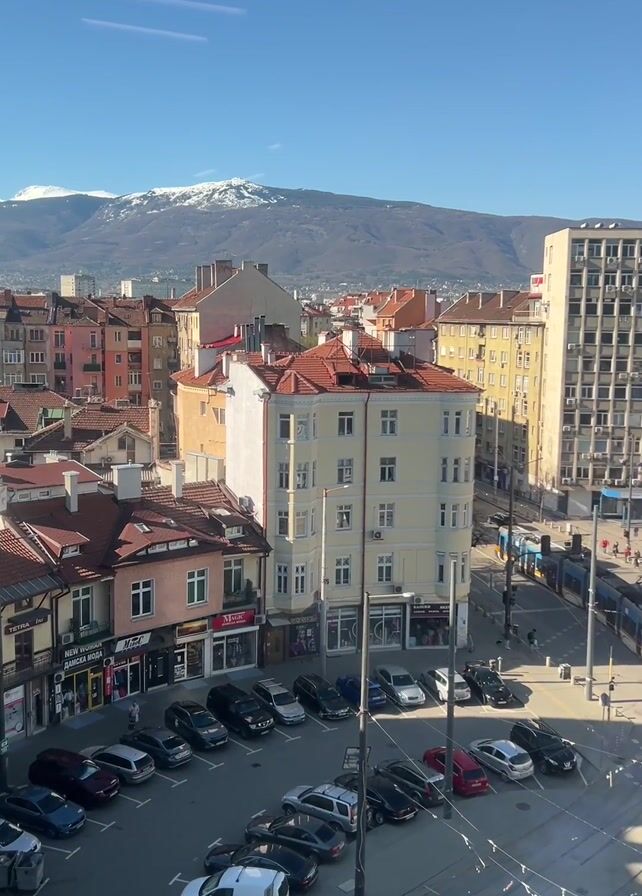 The camera pans right over a city view in daytime under a blue sky. Buildings and a snow-capped mountain can be seen in the distance. A parking lot with many parked cars is visible in the foreground, as well as several businesses. A street intersection with pedestrian crosswalks is visible, as well as a trolley with other vehicles going through the intersection. People can be seen walking near the intersection.