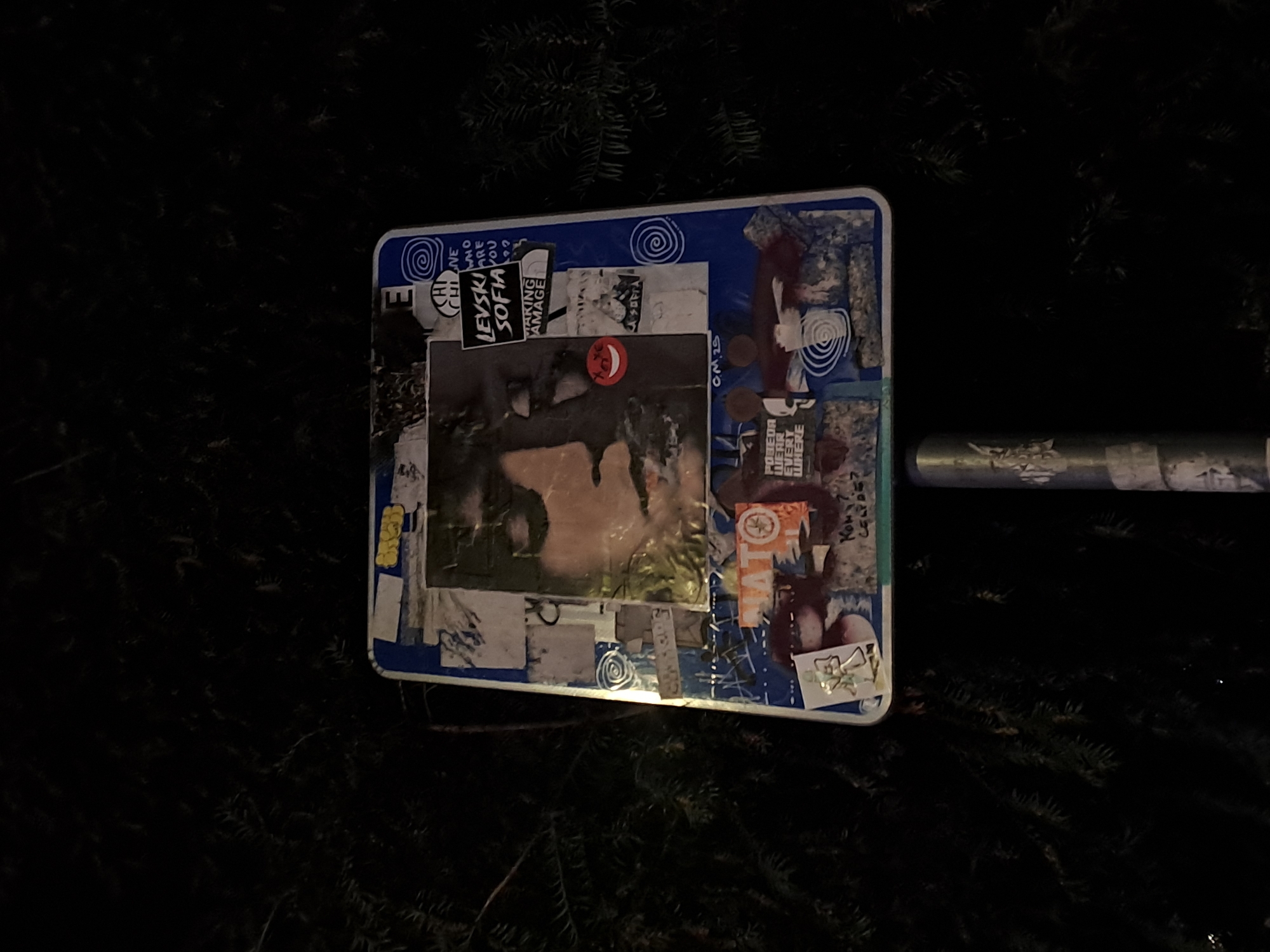 - "A close-up, dark-exposure photograph shows a rectangular signpost covered in stickers, affixed to a cylindrical pole, against a background of dark foliage" by FM-WTdz72, licensed under CC BY 4.0