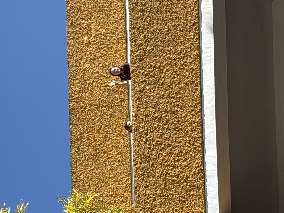 A vertical shot shows a textured yellow-orange wall with a white trim line dividing it from a gray wall. Two people appear to be looking out from windows; one near the top with a visible hand waving, and another head peeking out from below. The sky is a bright blue in the corner, with the tops of tree leaves visible at the bottom. The wall is the main focal point of the shot.