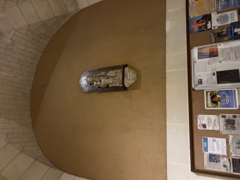 The image captures an interior view within the Basilique Sainte-Trinité, located in Cherbourg-en-Cotentin, France. The scene is dominated by a light-colored, segmented stone archway spanning the top of the frame, beneath which lies a large, uniformly painted ochre wall. Centered on the upper portion of the ochre wall is a cream-colored, carved religious statue depicting the Virgin Mary, seated and holding the Christ Child. This statue is housed within a dark wooden, arched frame or niche, and rests upon a small, light-colored stone corbel. Below the ochre wall, a horizontal band of off-white paneling extends across the frame. Directly beneath this paneling, a large cork bulletin board is affixed. The board is densely covered with various printed papers and flyers, predominantly featuring text in French. Visible items include a blue poster advertising "Catéchisme" (Catechism) with an image of a smiling child, and another poster displaying a cross motif with human figures. Other documents appear to be informational notices or local announcements. The overall lighting is subdued, suggesting an interior space with controlled illumination.