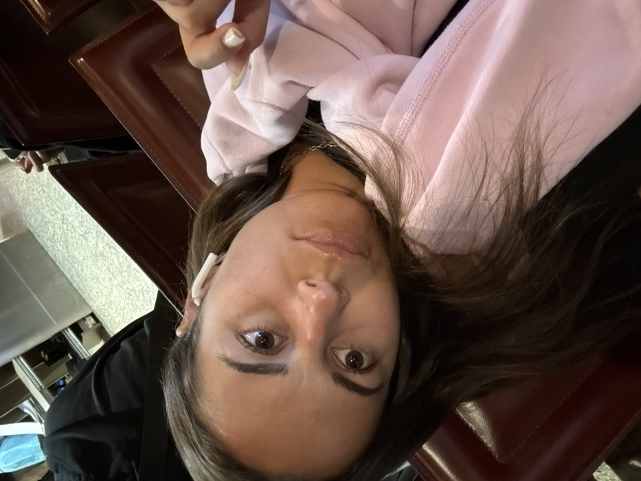 A woman lies on reddish-brown leather seating, capturing a selfie. She wears a light pink hoodie and has brown hair. An earbud is visible in her left ear. A shiny chain necklace is around her neck. Part of a table or counter appears in the background, along with what appears to be a black garment. The camera angle gives a slightly skewed perspective, and her gaze is directly at the lens.