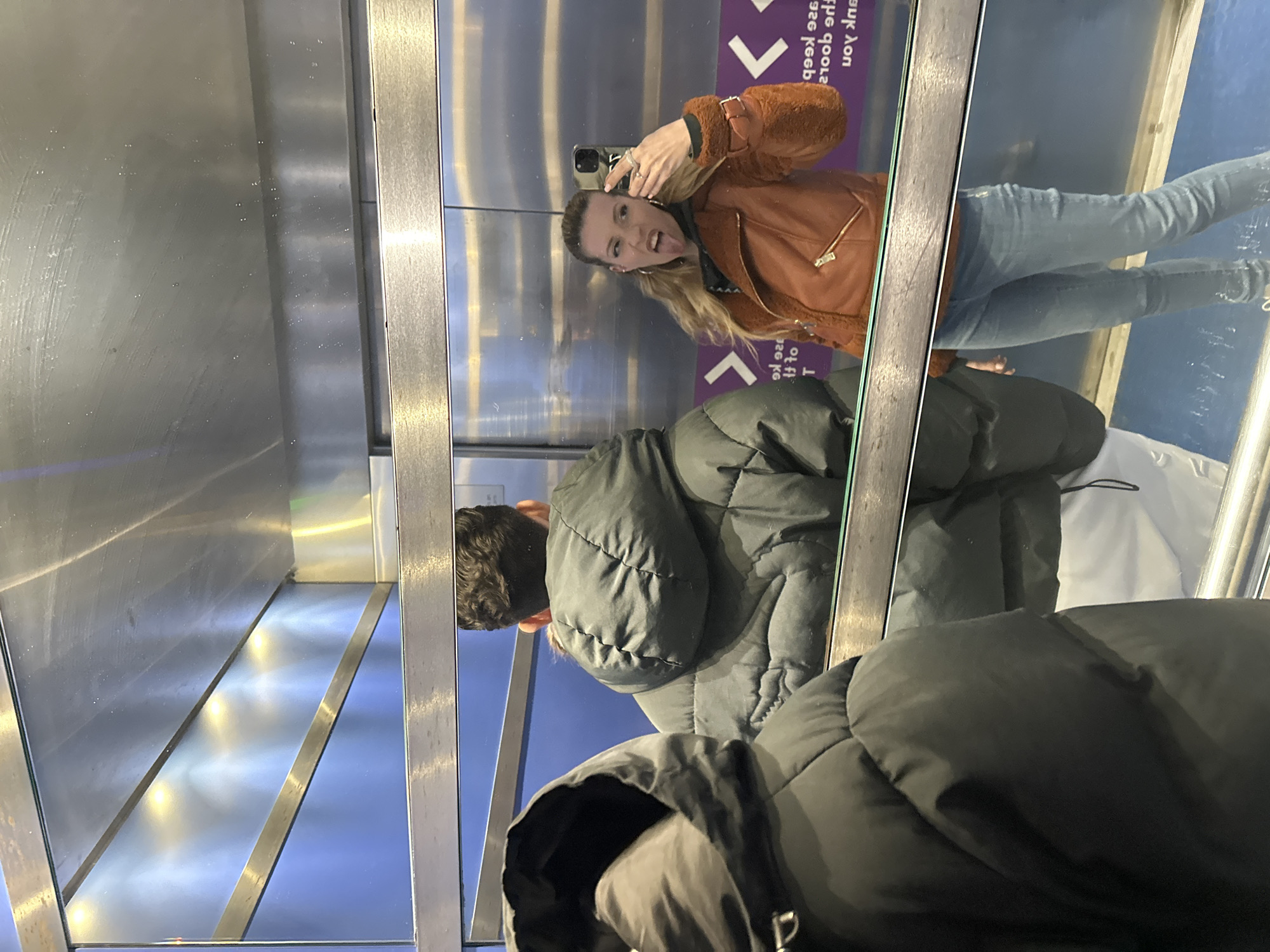 reflection in an elevator in Dartford, United Kingdom. A woman with blonde hair, wearing a brown jacket and blue jeans, holds a phone and sticks her tongue out while taking a selfie. Reflected behind her is a person wearing a dark puffer jacket. Another person wearing a black puffer jacket is also partially visible in the foreground. The elevator interior has metallic walls and reflective surfaces. A sign with purple arrows and text is also visible in the background.