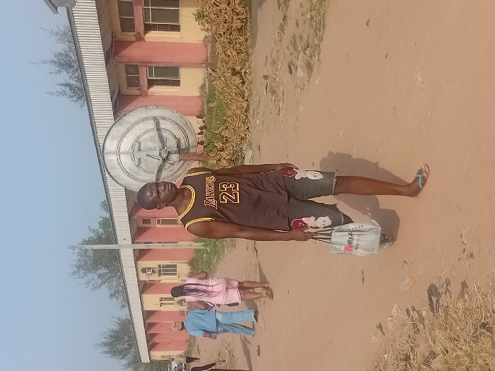 This image, taken in Egbagu, Nigeria, depicts an outdoor scene on a dry, unpaved dirt road under a clear daytime sky. In the foreground, a young adult male with a dark complexion walks towards the right, carrying a light-colored reusable shopping bag with red text in his left hand. He wears a dark brown basketball jersey with yellow trim, "LAKERS" text, and the number "23." He also wears dark denim shorts adorned with light-colored bear or bunny head appliques and light blue and green flip-flops. His gaze is directed slightly to the right of the camera. In the midground, to the left of the central figure, two individuals walk away from the camera: one in light blue attire and another in a light pink two-piece outfit. A third person is partially visible on the far left edge. The background features a long, single-story building with a light-colored facade, reddish-brown columns, and multiple windows, topped with a silver corrugated metal roof. A large, circular metallic dish-like structure, possibly a satellite dish, stands on a support base in front of the building to the right of the central figure. Scattered dry brush and foliage are visible on the ground in front of the building, especially around the dish. A utility pole and several coniferous trees are present in the far background.