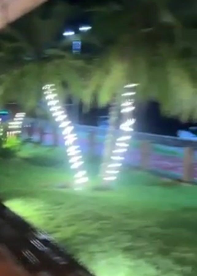 A woman is seated at a wooden table outside a restaurant at night. She has brown hair, wears a white top, and is smiling at the camera. A plate and silverware are on the table. The camera pans to show a view of a waterfront with several small boats moored near the shore. A paved path with a painted red stripe runs along the water's edge, bordered by grass and trees decorated with lights. The opposite shoreline is visible in the distance, with lights indicating buildings or a town. The overall setting appears to be a pleasant evening atmosphere at a seaside location.
