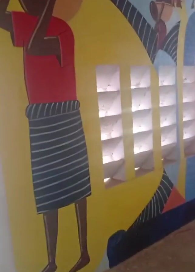 long mural on a wall inside what appears to be a school building. The mural is brightly colored with depictions of people carrying items on their heads and silhouettes of figures. The mural is painted around a set of small, rectangular windows. People are seen walking down the hallway in the background. The wall seems to be adjacent to a corridor or hallway.