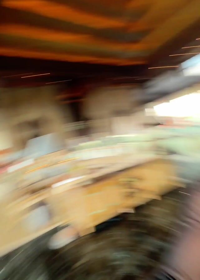 A woman stands on a glass floor, looking down, then she turns the camera to herself, and looks around. The woman has her hair pulled back and is wearing sunglasses, a black top, and a skirt. The floor she is standing on looks like a marble pattern and above her is a ceiling with beams and skylights.