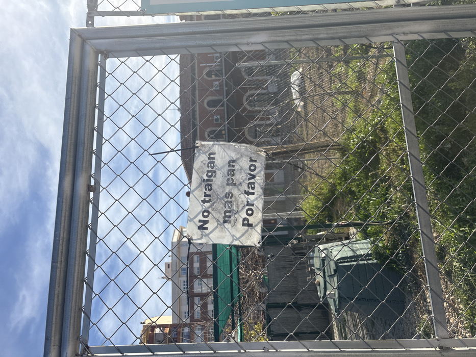 The image displays a weathered white sign attached to a galvanized metal chain-link fence, centrally positioned in the foreground. The sign, secured by black zip ties, features three lines of black capital text: "No traigan mas pan Por favor" (Do not bring more bread Please). Behind the fence, an outdoor area with sparse vegetation and bare earth is visible. To the left, a dark green, rectangular compost bin or similar container rests on the ground. Adjacent to this, a section of slatted fencing or an enclosure made of vertical slats is partially obscured by dry branches. Further to the right and deeper into the area, a white, elongated object lies on the ground. In the background, under a partly cloudy blue sky, several buildings are present. To the far left, the upper floors of a multi-story residential building with light-colored facades are visible. To the right, a larger, older building with a red tiled roof and multiple arched windows, indicative of an institutional or historical structure, dominates the mid-ground. The scene is illuminated by bright natural daylight. This specific location is in the city of Alcoi / Alcoy, Spain.