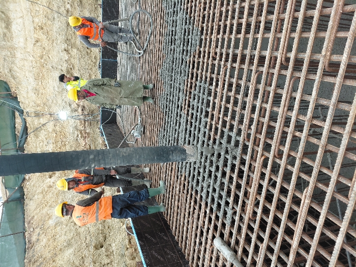 At a construction site in Sidi Moussa Ben Ali, Morocco, a concrete foundation or slab is actively being poured. The scene is dominated by a dense grid of rusty rebar laid horizontally, forming the reinforcement for the concrete. A thick black hose from a concrete pump extends vertically downwards into this rebar grid, actively discharging wet, grey concrete. Portions of the rebar grid already show fresh concrete settled beneath and around the bars. Six individuals are present, all appearing to be construction workers or supervisors. All wear yellow hard hats, and most wear orange high-visibility safety vests. 1. On the far left, a worker in an orange vest with a logo, blue trousers, and green rubber boots stands near the pump hose, facing a second worker. 2. The second worker, directly to the right, wears an orange vest, dark trousers, and light boots, appearing to interact or coordinate with the first worker near the pouring concrete. 3. In the center-right, a worker in a long, light-colored trench coat, a yellow hard hat, and green rubber boots stands observing the operation. 4. To the right of the trench-coated worker, another worker in an orange vest and light trousers actively operates a concrete vibrator tool, holding its looped hose, to consolidate the newly poured concrete. 5. Further in the background, to the right of the pump hose, a worker in a yellow high-visibility vest and hard hat is partially visible, appearing to observe. 6. A sixth individual, partially obscured by the trench-coated worker, is also visible in the background, similarly dressed in a high-visibility vest and hard hat. The environment consists of excavated earth with high, uneven light-brown soil walls in the background. A dark, possibly waterproof, membrane lines the lower section of these walls, indicating formwork for the foundation. A bright portable work light on a stand illuminates a section of the dirt wall in the background. Green netting or tarp is visible along the upper edge of the excavated area.
