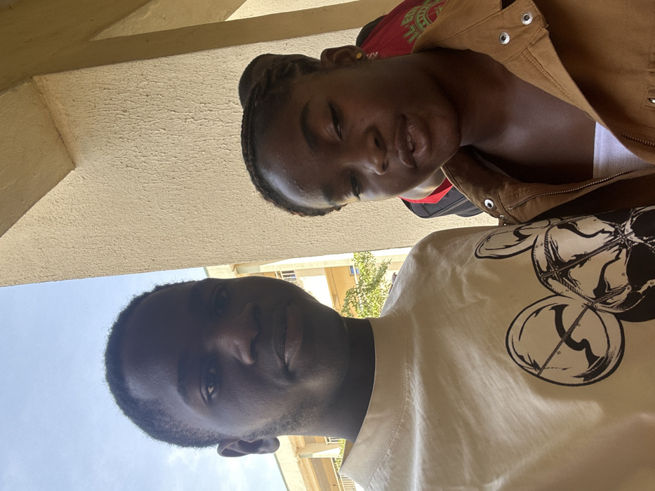 An eye-level, close-up photograph depicts two individuals, a male and a female, in Wumat, Nigeria. The male subject, positioned on the left, wears an off-white short-sleeved t-shirt featuring a large black graphic design composed of abstract, skull-like elements with intersecting lines and circular forms. He has dark, closely cropped hair and visible stubble along his jawline. The female subject, positioned on the right, wears an unzipped brown collared jacket over a white bandeau top. Her dark hair is styled in thin braids. Both subjects are looking directly towards the camera. In the immediate background to the right, a textured, light-colored concrete wall is visible, extending diagonally upwards. To the left and in the distance, a multi-story building with yellow exterior walls and rectangular windows is partially visible under a bright, clear blue sky. Green foliage from a tree is discernible between the subjects and the distant building. A red and green patterned fabric is partially visible behind the female subject's right shoulder. The scene is illuminated by natural daylight.
