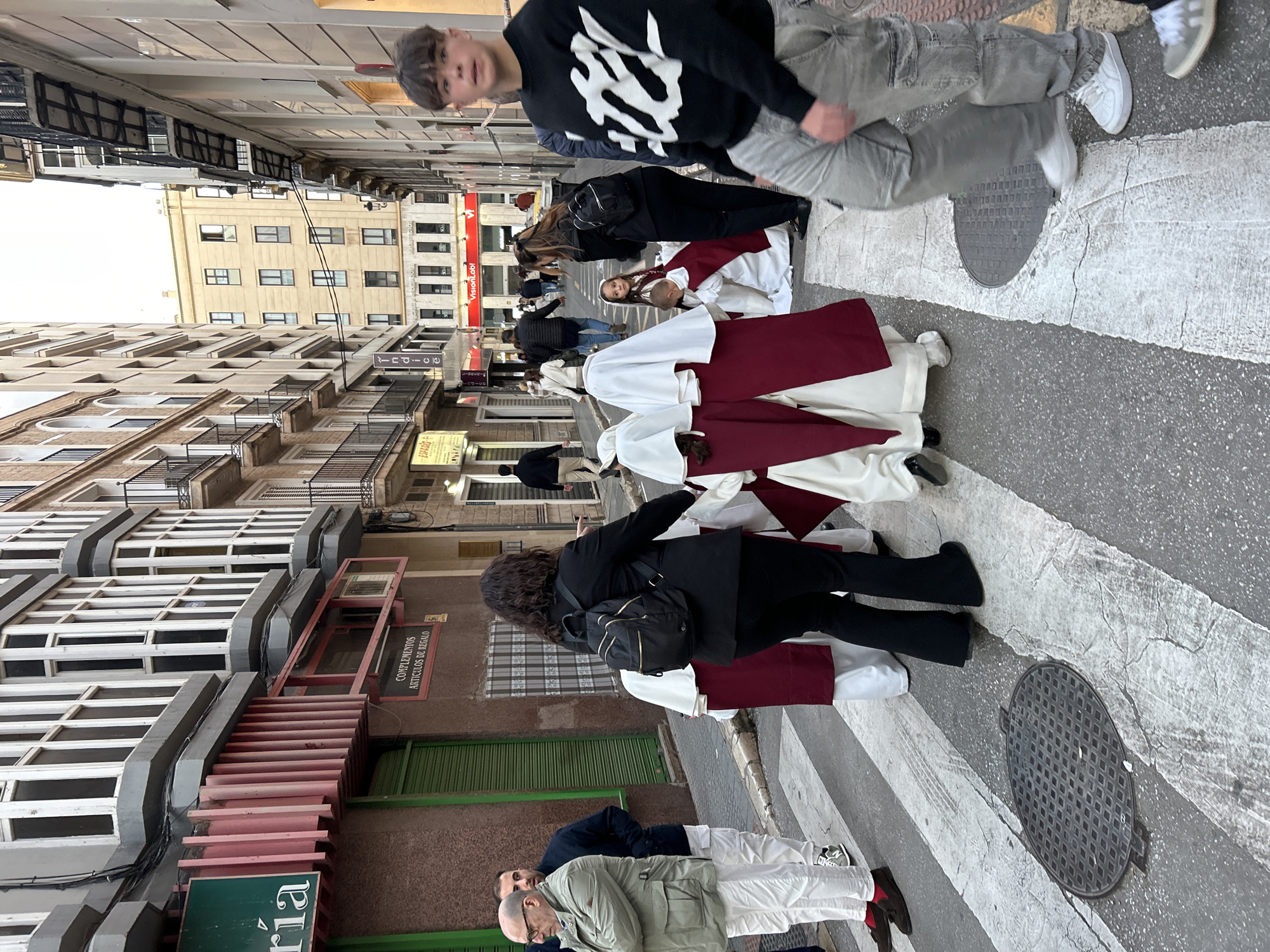 The image depicts a street scene in Málaga, Spain. A religious procession is underway, with participants wearing traditional white robes and conical hoods. They are crossing a pedestrian crosswalk on a narrow street lined with tall buildings, many of which have balconies. The procession is likely related to Holy Week (Semana Santa) celebrations. In the foreground, a young man in a black and white sweater and gray pants walks along the crosswalk, appearing to cross paths with the procession. Nearby are other people in casual attire. A woman in a black jacket and carrying a backpack walks near the robed figures. A man in a green jacket and white pants stands near a shop with a sign in Spanish. The buildings lining the street vary in architectural style. Some have detailed facades, while others are more modern. Signs on the buildings suggest commercial establishments. The street surface is paved, and the crosswalk is marked with white stripes. Manhole covers are visible on the street.