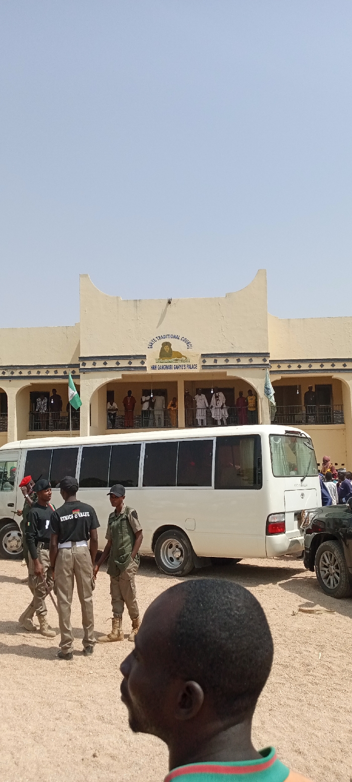 The image depicts an outdoor scene at the HHH Gangwari Ganye's Palace in Ganye, Nigeria