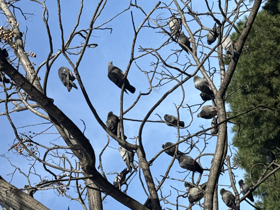 The image displays an outdoor scene in Barcelona, Spain, focusing on the upper and mid-sections of a large deciduous tree with numerous bare, dark brown branches and twigs, silhouetted against a clear, vibrant blue sky. Scattered across the branches are approximately 25 domestic pigeons (Columba livia domestica), varying in shades of grey, white, and black, most appearing to be in a resting posture. Several clusters of small, dried, light-colored berries are visible on some of the thinner upper branches. One pigeon in the upper right section of the frame is observed with its tail slightly elevated, facing left. The lower portion of the image reveals the dense, dark green foliage of an evergreen tree or shrub, situated beneath the primary tree's branches, indicating a park or urban green space environment.
