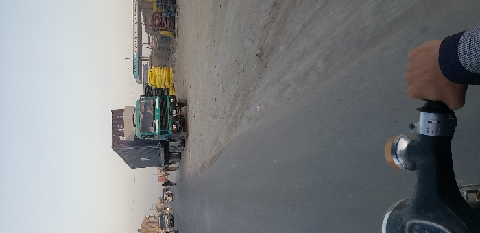 This image captures a first-person perspective from a moving scooter on a multi-lane road in Kandahar, Afghanistan, during what appears to be dawn or dusk. In the immediate foreground, a person's right hand, wearing a plaid-sleeved garment, grips the black throttle of a scooter's handlebar. The handlebar features a chrome-plated component, a round amber indicator light, and a gear selector switch marked with "1," "2," and "3." The paved road surface, appearing worn asphalt, extends into the midground. A large green semi-truck with a cab-over-engine design, hauling a dark blue shipping container marked "45," is positioned on the right side of the paved road, moving away from the viewer. To the left of the semi-truck, further down the road, other vehicles are visible, including white cars or vans and a small white three-wheeled vehicle. Several pedestrians are sparsely distributed on the paved road and its immediate dirt shoulder. To the right of the paved road, an unpaved, dusty shoulder or lot contains stacks of materials. Prominently visible are large quantities of stacked yellow items, possibly pipes or construction beams, and further back, reddish-brown stacked materials. Distant structures, including what appears to be a light blue open-sided canopy or shelter, are discernible on the right horizon. The background features a light, uniform sky, devoid of harsh sunlight, consistent with low-light conditions. Power lines or overhead cables are visible stretching across the sky. The overall environment suggests an active, semi-industrial or commercial roadside area.