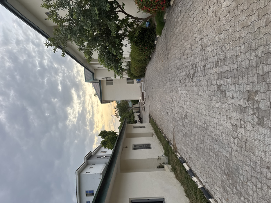 This image depicts an outdoor paved area within a compound in Lokoja, Nigeria, under an overcast sky with a visible band of warm, yellowish light at the horizon, suggesting either sunrise or sunset