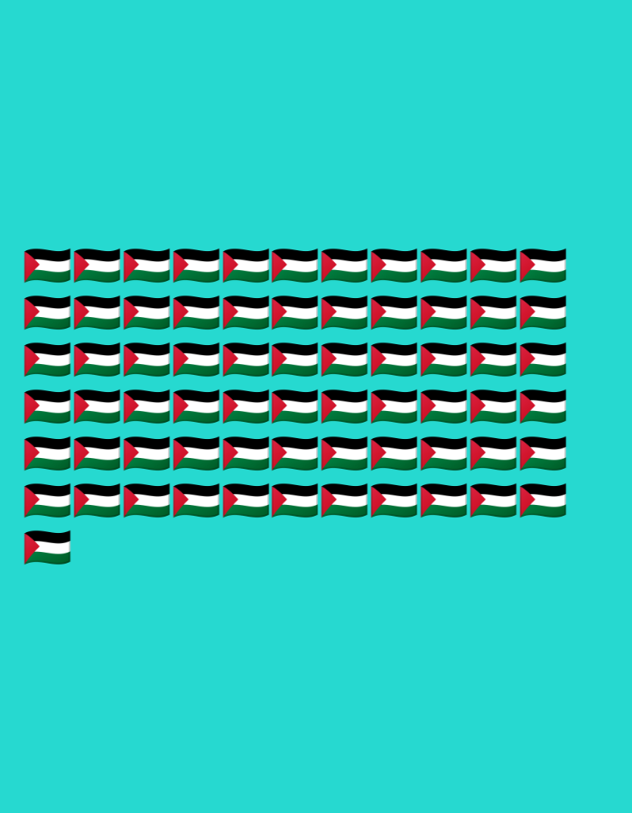 A pattern of waving Palestinian flags fills the upper portion of a turquoise background. The flags are arranged in a grid-like formation with seven rows and seven columns, but one flag is missing from the last row. The flags are depicted as simple, stylized illustrations.