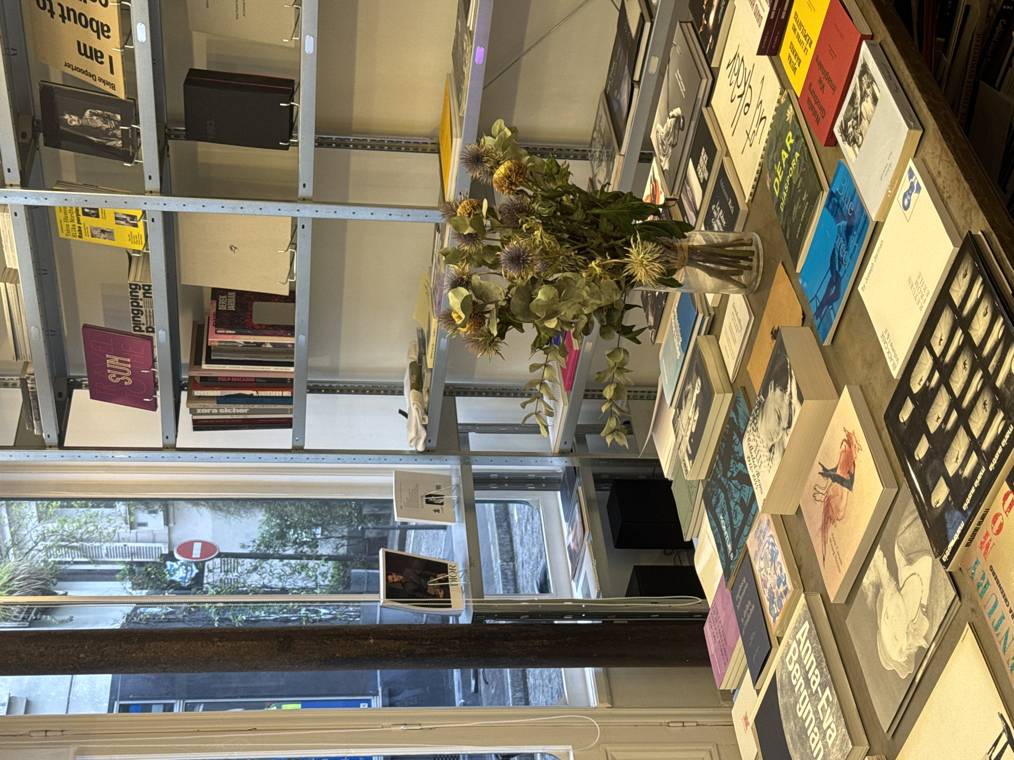 bookstore interior, likely located in Paris, France, given the architectural style and window view. Books are displayed on shelves, with a vase of dried flowers placed centrally on a table filled with books. The view from the window includes a street with pedestrian signs, and buildings across the street. The focus of the image is on the books and floral arrangement.