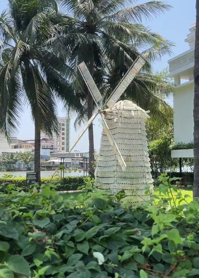 decorative windmill in a garden setting. The windmill appears to be made of white material and is surrounded by lush green plants. Palm trees are visible in the background, along with buildings in the distance across a body of water. The sky is clear and blue. The camera is static, and there are no people visible in the frame.