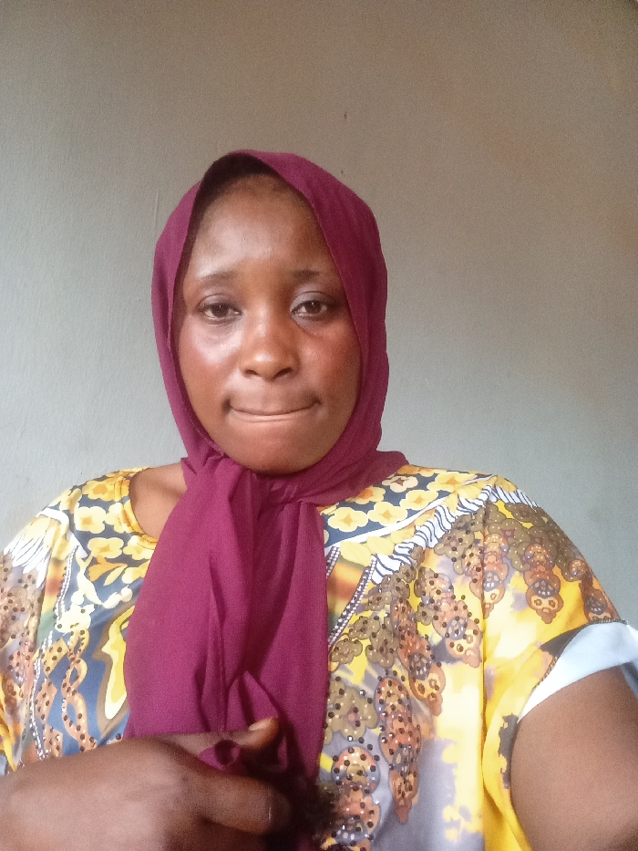 A medium close-up image depicts a single adult female in an indoor setting. The individual has a medium brown complexion and is wearing a dark red or maroon hijab that covers her hair and neck. Her eyes are directed towards the camera, and her mouth is slightly pursed. She is dressed in a short-sleeved garment featuring a yellow, grey, and white abstract pattern, which includes floral-like motifs and clusters of dark, possibly beaded or sequined, dots. Her hands are positioned at the bottom of the frame, appearing to be clasped or holding a dark, fluffy object. The background consists of a plain, light grey wall. The exact location within the city of Unknown, Unknown, cannot be determined from the image.