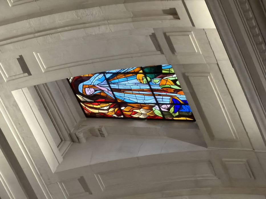 - "A vertical rectangular stained glass window is centrally displayed within a deep, light-colored architectural recess" by FM-7gWCF3, licensed under CC BY 4.0