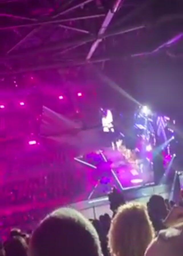 concert in a large venue. The stage is lit with bright purple and white lights, and a large screen displays images. A performer can be seen on the stage, surrounded by dancers. The audience is packed in front of the stage, with many people raising their hands in the air. The ceiling of the venue is visible, with a complex network of metal beams. The video is shot from the perspective of someone in the audience, looking towards the stage.