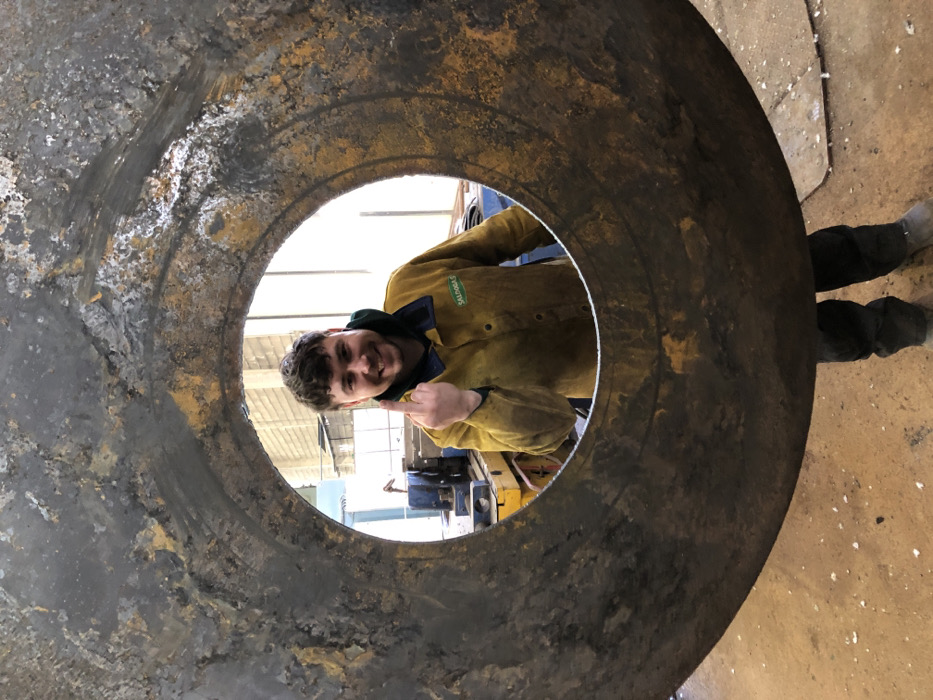The image displays an indoor industrial workshop in the city of Čeluga, Montenegro. A young adult male with short dark hair stands prominently in the foreground, smiling directly at the camera. He wears a yellow work jacket with a "SALDOGAS" logo on the left chest, a green hooded sweatshirt visible beneath, dark trousers, and work boots. He is holding a large, thick, circular metal disc, approximately waist-height, which features a substantial central circular cutout. The male's head and upper torso are framed within this cutout. The metal disc exhibits a dark, textured, and heavily rusted surface. The male's right hand is raised, with the middle finger extended. In the background, seen through and around the metal disc, are various pieces of industrial machinery and equipment, predominantly yellow and blue, alongside a light-colored building structure. The floor is concrete, scattered with minor debris.