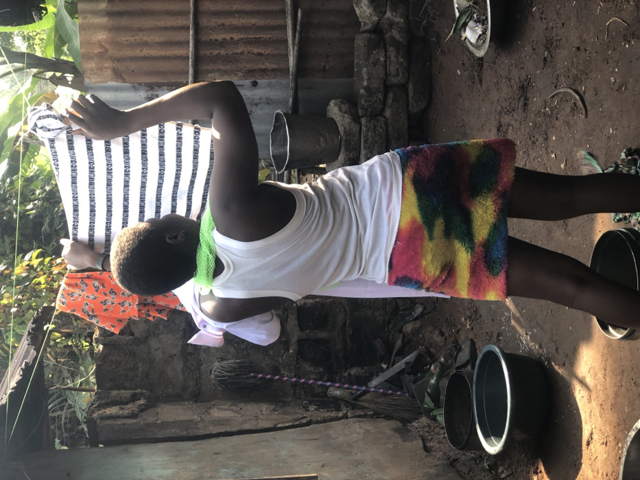 A person, viewed from behind, is hanging laundry on an outdoor clothesline in Orifite, Nigeria