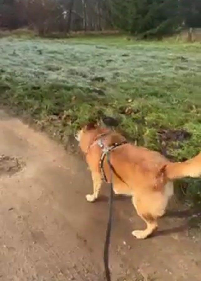 medium-sized, golden-colored dog walking on a dirt path in what appears to be a park or rural area. The dog is wearing a harness and is attached to a black leash, which is held by someone out of frame. The dog wags its tail as it walks. To the side of the path, there is a field of grass covered in frost. Trees are visible in the background. The sky is overcast.