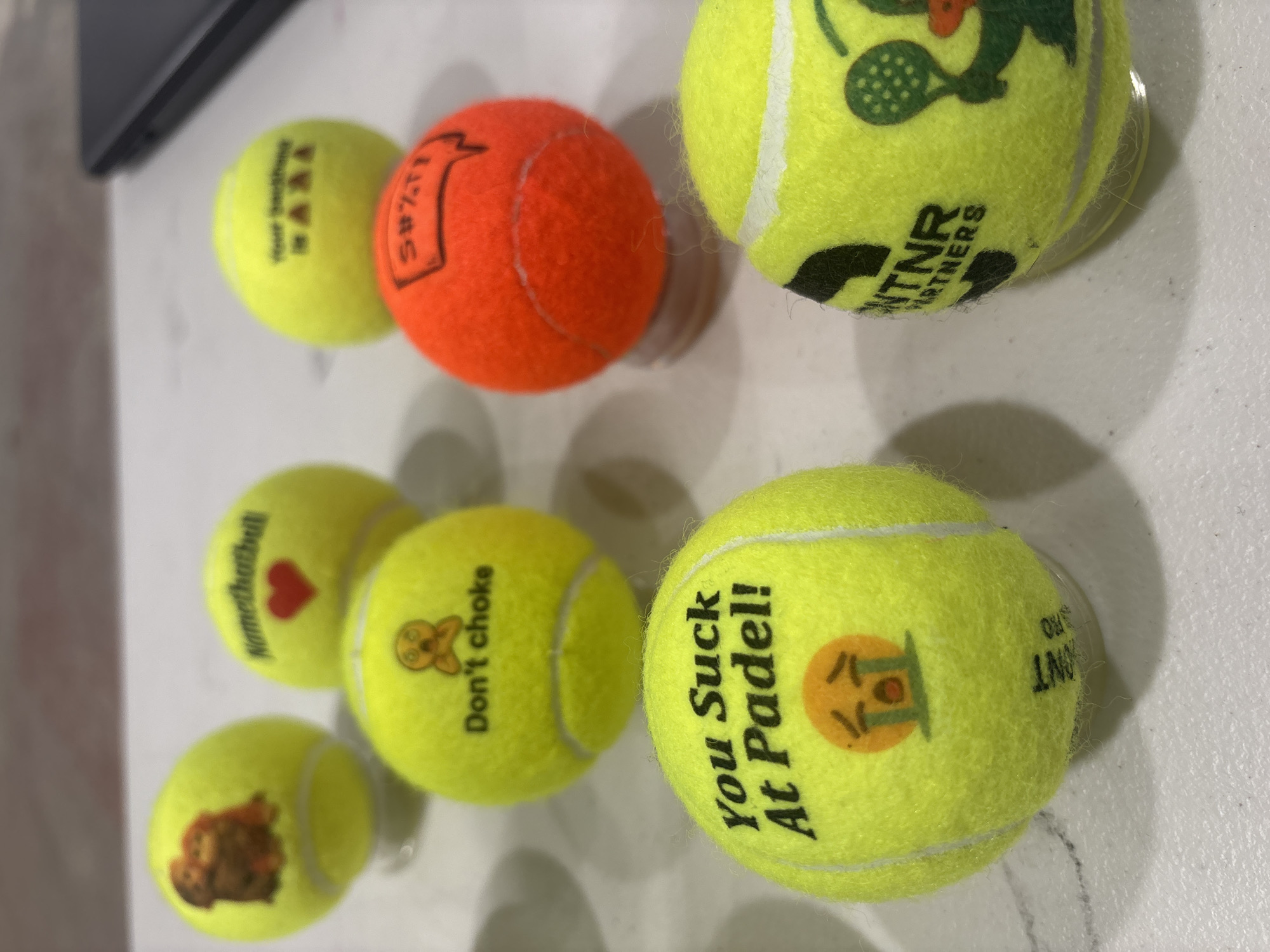 The image displays a close-up, overhead view of eight custom-printed padel or tennis balls arranged on a light-colored, textured surface, likely a tabletop. No specific location within London, United Kingdom, can be identified from the visual evidence. The objects consist of seven fluorescent yellow-green balls and one orange ball. Each ball features unique black printed text and/or graphic designs: - One yellow ball in the upper left displays an image of two brown, furry creatures hugging. - Another yellow ball features the text "Namethatball" and a red heart emoji. - A third yellow ball in the upper right has blurry text that includes "Your business". - A central yellow ball reads "Don't choke" accompanied by an emoji depicting a face with hands around its neck. - The single orange ball displays a black speech bubble containing "S#%T!". - A prominent yellow ball in the lower left foreground states "You Suck At Padel!" above a crying emoji, and "ONTNR PARTNERS" with a stylized green figure holding a padel racket around its base. - A partially visible yellow ball in the lower right foreground also shows "NTNR PARTNERS" and a green figure with a padel racket. The background is uniformly blurred, showing the light-colored surface and a dark, indistinct object, possibly an electronic device, in the upper right quadrant. No people, specific actions, or interactions are present.
