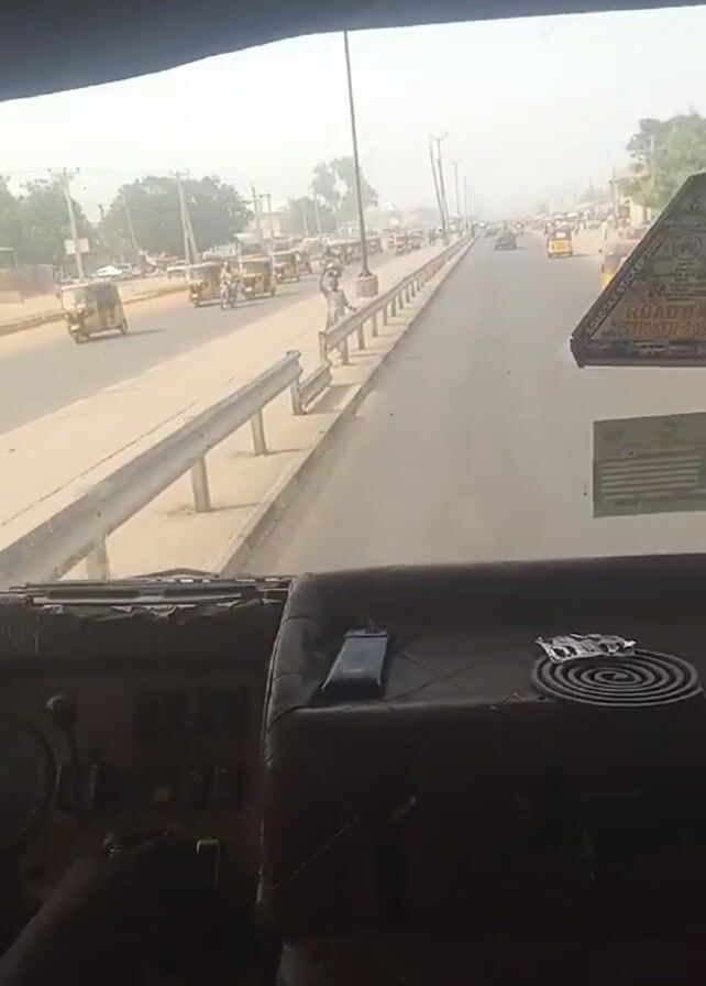 view from the cab of a large vehicle, likely a bus or truck, moving down a road in what appears to be an urban or semi-urban area