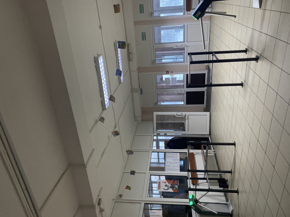 An indoor scene shows a hallway with white tiled floors, white walls, and a white ceiling. A row of fluorescent lights runs along the ceiling, decorated with small cards or pictures hanging from strings. Several windows and doors line the far wall, some with security gates. A turnstile with green lights is visible in the foreground, and a bench is visible in the middle ground. The scene is angled to the right.