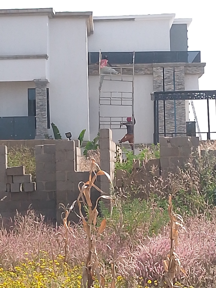 The image, captured in Kwang, Nigeria, depicts an outdoor scene with apparent construction or maintenance activity under daylight conditions. In the foreground, a dense field of tall, dried-out stalks resembling corn is present, interspersed with varied green, purple, and yellow herbaceous vegetation, including small yellow flowers. A partially constructed cinder block wall segment is visible in the midground. Against a multi-story building, a metal scaffold is erected. Two individuals are on the scaffold: one is seated or crouching on the top platform, wearing a red shirt and a light-colored outer garment. A second individual, positioned lower on the scaffold, wears a red head covering, a dark shirt, and brown trousers, holding a tool consistent with a spray gun or paint roller, directed towards the building's white facade. The building exhibits a modern architectural style with white exterior walls, dark-tinted windows, decorative stone-clad columns, and a dark balcony railing on the upper level. Green broad-leafed plants and a black floodlight are situated at the base of the building. The sky above is bright and clear.