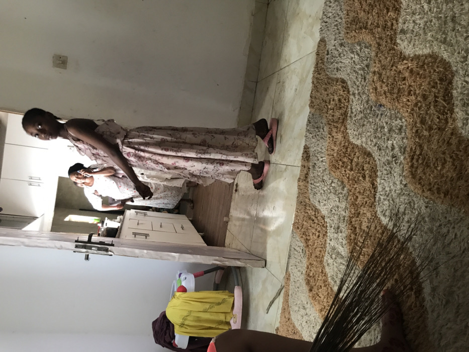 The scene depicts an interior view of a residential dwelling in Unknown, Unknown, encompassing two connected rooms. In the immediate foreground, a person's bare feet are visible, holding a natural fiber broom over a floor covered by a beige and brown wavy-patterned shag rug. The area around the rug is tiled. To the left, a multi-colored baby walker is partially visible, draped with a yellow cloth and a darker fabric, with a pair of pink slip-on shoes resting nearby. Standing in the doorway, positioned between the two rooms, is a young female. She faces the viewer directly, wearing a light-colored, long floral dress with thin straps and pink flip-flops. Her hair is dark and appears pulled back. Behind her, in the adjacent room, an adult female is visible. She wears a light-colored dress and holds a dark-colored object, consistent with a mobile phone, to her right ear. This background room, identified by the presence of light-colored upper and lower cabinets and light-toned walls, appears to be a kitchen or utility area. The floor in the background room is also tiled. Both areas are brightly illuminated, suggesting an ambient light source.
