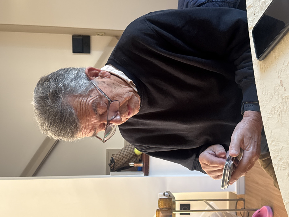 The scene depicts an elderly male individual seated indoors within a residential setting in Porto, Portugal. He possesses grey hair, wears dark-rimmed eyeglasses, a black long-sleeved shirt over a light collared shirt, and a dark smartwatch on his left wrist. The individual is actively engaged with a silver-colored smartphone, held in his left hand, and operates its screen with his right index finger. A second black smartphone is positioned face-down on a light-colored, textured tablecloth in the foreground. To the immediate left, a gold-colored multi-tiered side table holds several amber-colored cylindrical objects. A pink slipper is partially visible on the wooden floor to the far left. In the background, beyond an open doorway or archway, a patterned tote bag, a green tennis ball, and a white container are present on a low shelf or ledge. A black rectangular wall-mounted device is affixed to the right wall in the background.