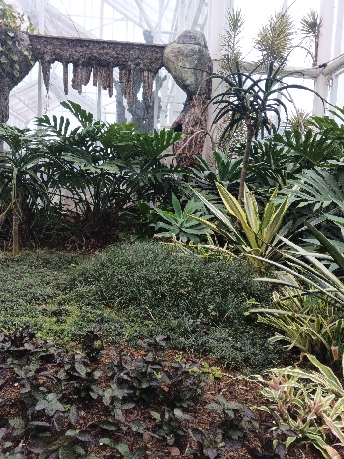 Lush greenery dominates the scene, featuring a variety of tropical plants. Broad-leafed philodendrons mix with spiky aloe-like species, all thriving in a seemingly indoor environment. The ground is covered with a dense, moss-like plant, interspersed with patches of dark purple foliage. In the background, a decorative faux rock structure and a greenhouse-style frame are visible, contributing to the botanical garden ambiance.